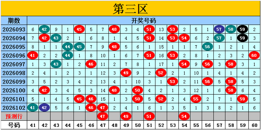 目前第三区包含11个热码:重码4个41、42、46、47,邻码2个45、48,孤码5个50、52、55、58、59;包含8个温码:邻码1个43,孤码7个44、49、51、53、54、56、60;包含1个冷码:邻码0个,孤码1个57;号码冷温热个数比为1:8:11,重号、邻码、孤码个数比为4:3:13。