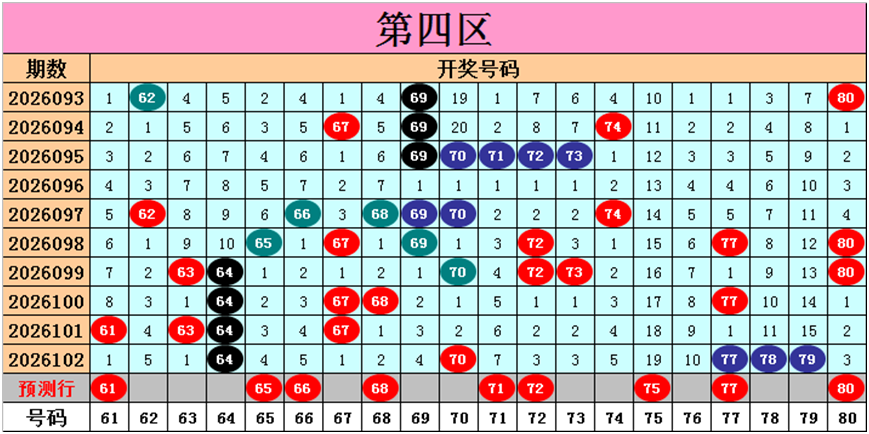 目前第四区包含9个热码:重码5个64、70、77、78、79,邻码1个63,孤码3个61、67、68;包含8个温码:邻码3个65、69、80,孤码5个62、66、72、73、74;包含3个冷码:邻码2个71、76,孤码1个75;号码冷温热个数比为3:8:9,重号、邻码、孤码个数比为5:6:9。