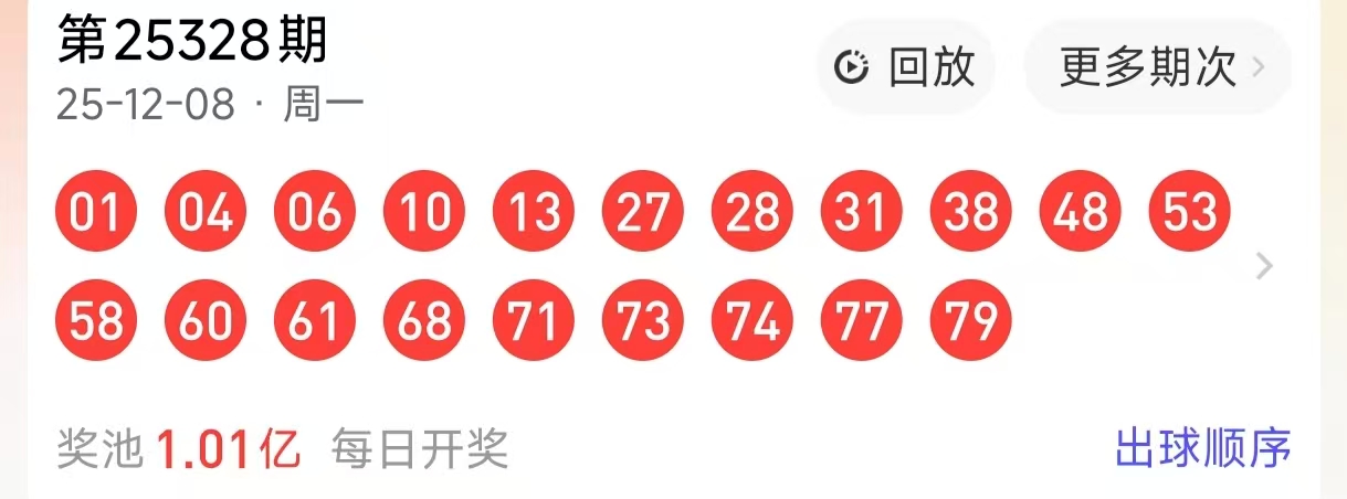 各位彩民朋友,快乐8第25328期官方开奖结果已确认:01、04、06、10、13、27、28、31、38、48、53、58、60、61、68、71、73、74、77、79这20枚号码,走势明明白白没毛病!咱对着开奖数据唠干货,不搞虚的: