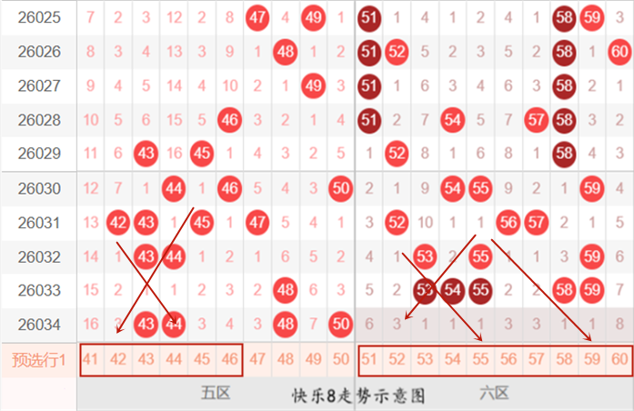 第五区间,上期开出四码,目前此区间处于大冷区间,根据走势分析预计本期此区间将在前中端开号,预计将继续出现走热趋势。