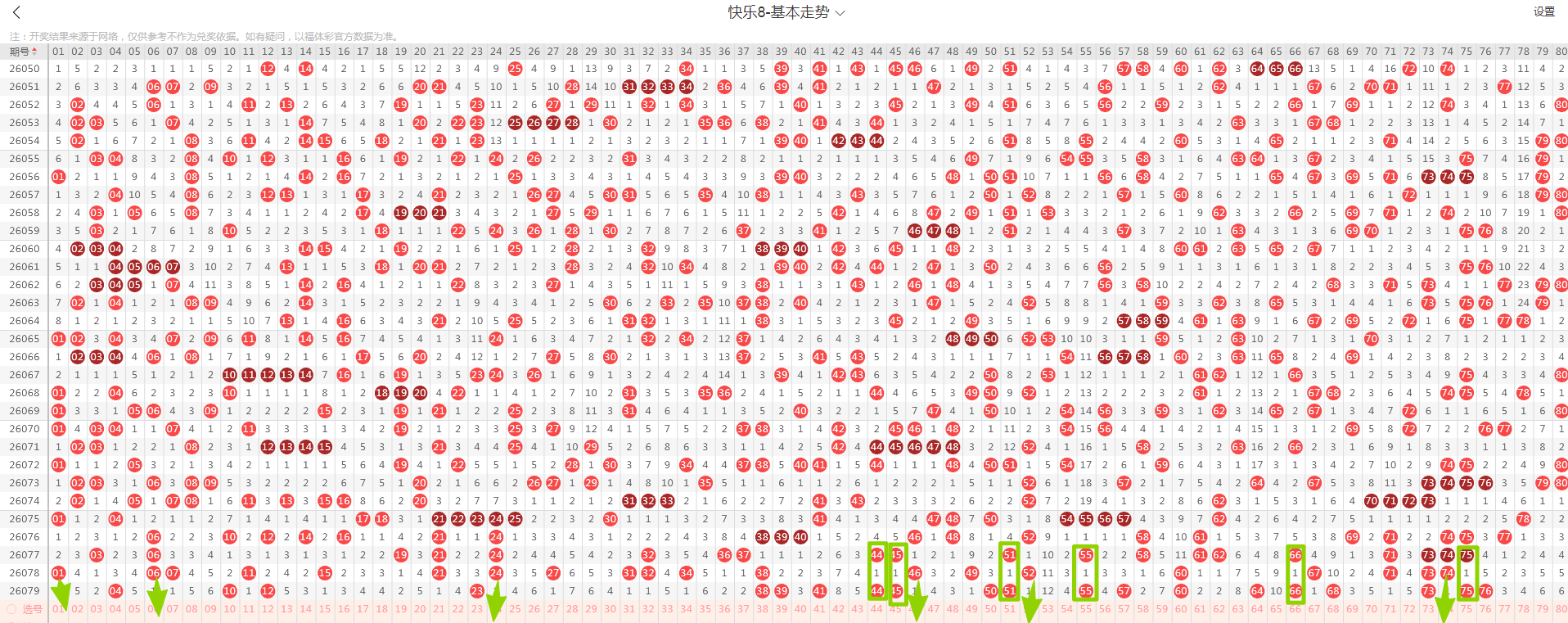 从这张走势图可以看到绿色方框标出来了遗漏一期的示意号码,开出了隔期(遗漏一期的)6个号码(绿色方块标示的),数量与上期增加,从近期走势图看隔期码回温态势形成,本期判断热度继续回温,落号6个号码概率较大(绿色箭头标示的01、06、24、46、52、74)需要关注,有下号概率;