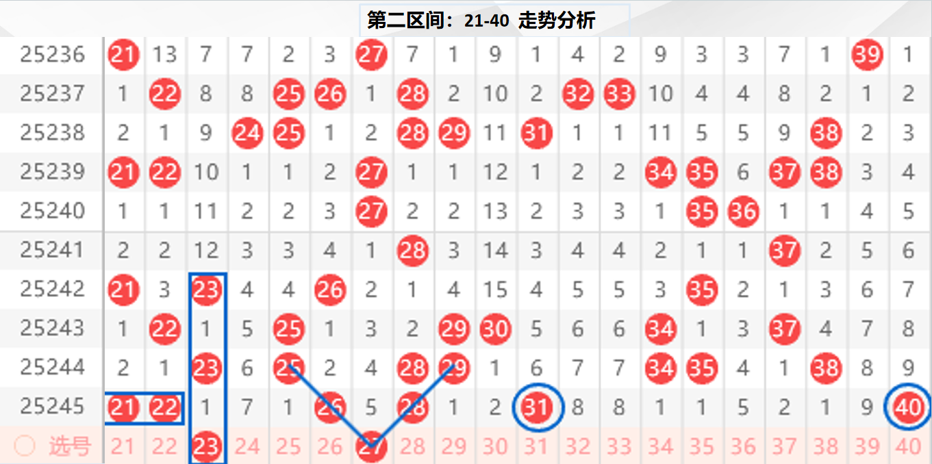 二区分析:【21-40】(走势图标注号码非小黄车大底,请谨慎参考,具体思路将在直播间分享讨论)
