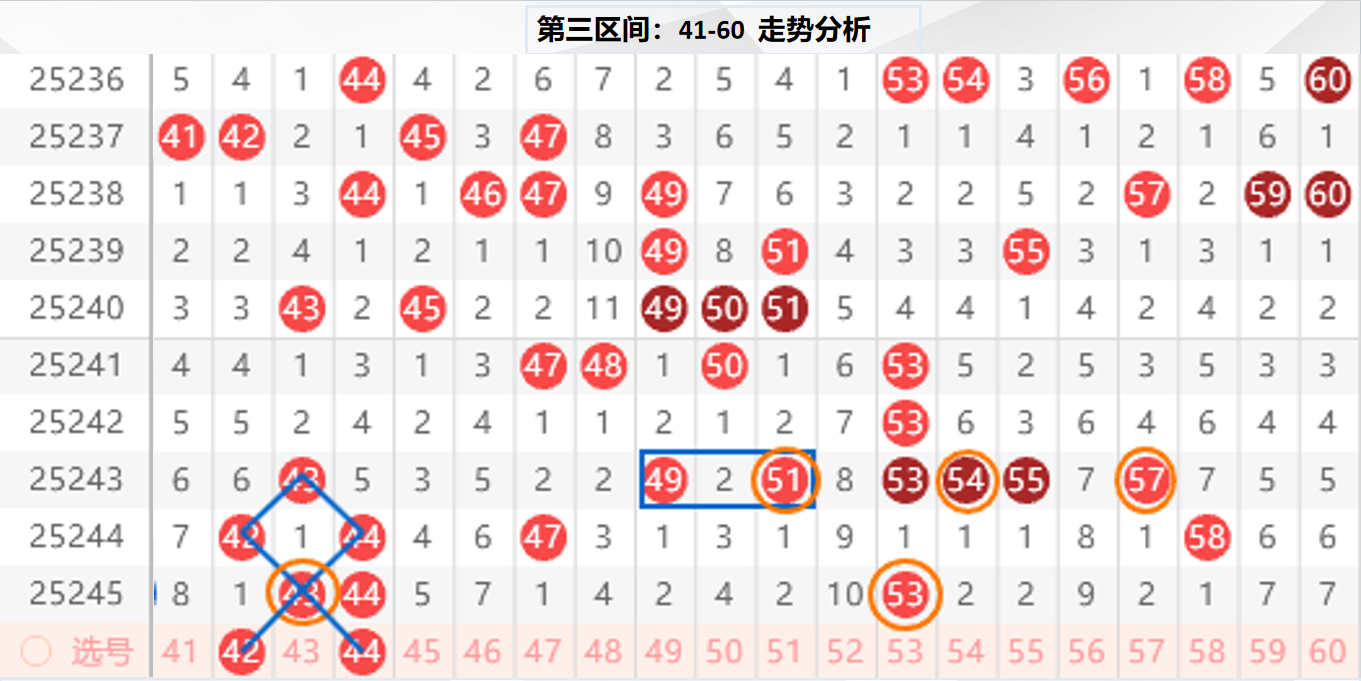 三区分析:【41-60】(走势图标注号码非小黄车大底,请谨慎参考,具体思路将在直播间分享讨论)
