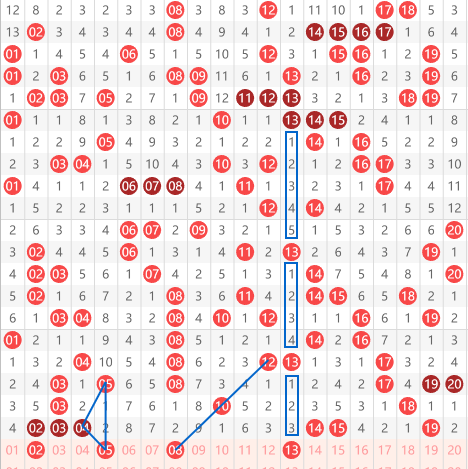 快乐8第2026061期01-20区域,推荐的05可以看到05跟04之间的一个三角夹角关系,以及02与05的搭档关系,然后就是08的回首掏,可以看到,12间隔一期给出10再间隔一期给出08.还有就是13我们看到13是个间隔5-4-3的间隔递减走势,以及14斜着出15的走势.