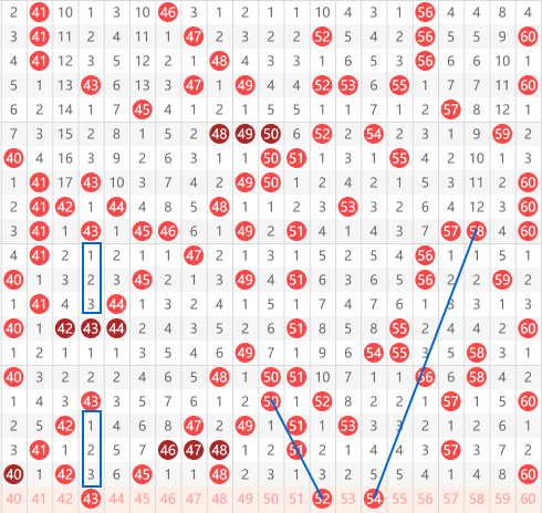 快乐8第2026061期41-60区域:推荐的第一个推荐的号码是 43,大家看到他有一个间隔三然后间隔二再间隔三的对称走势,以及41-42-43然后就是52号的走势,50-51-52以及54-53-52的间隔一走势,在往后就是54的走势,我们可以看到58间隔四期出56然后再间隔4期出54的间隔2斜连。以及60间隔二出57然后再间隔二出54的走势