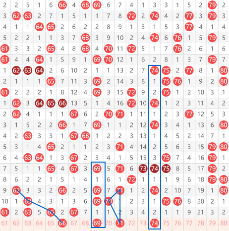 快乐8第2026061期61-80区域:推荐的第一个号码是66,大家可以看到52写着开出63然后间隔一期出65再斜着出66的斜连对称走势, 然后就是69上下间隔一的对称走势,下面就是他本身就是间隔2-1-1-2的对称以及71跟70之间的三角夹角走势, 最后一个号码是 74号的走势间隔对称,上面是间隔二然后间隔一,在间隔三再间隔一然后再间隔二的走势。以上是今天推荐的所有号码,具体的请根据自己的思路与想法进行选择