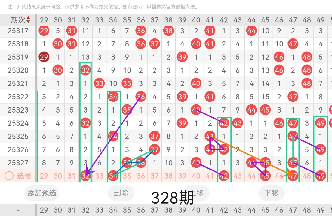 小梁根据上图的画线和走势可以看出:号码32与前几期开出的号码呈左斜三连的走势且呈连续隔三期回补的走位;号码34与前几期开出的号码呈斜连前后相互平行的走位且呈连续隔两期回补的走势;号码42与前几期开出的号码呈斜连前后相互平行的走势且呈连续隔期回补的走位;号码45是上期开出的重号且与前几期开出的号码呈斜连的走势;号码47是上期开出的重号且与前几期开出的号码呈斜三连的走位;号码49与前几期开出的号码呈斜连前后相互平行的走位且呈连续隔期回补的走势。
