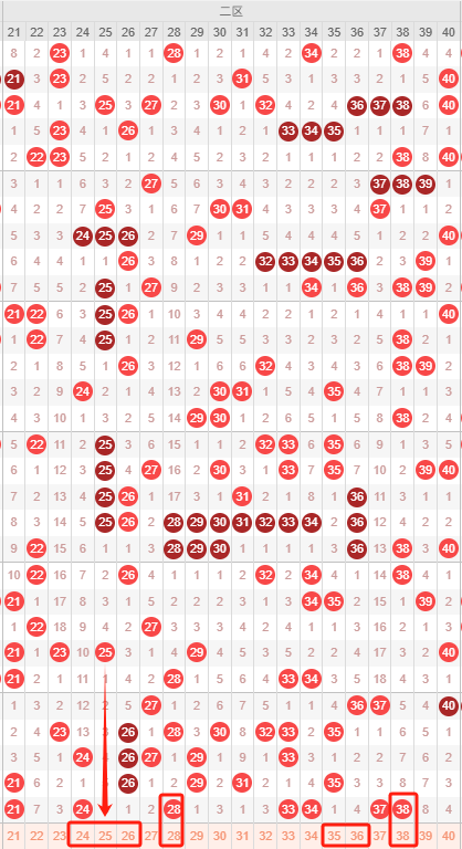 二区:最近二区10期出号情况为:5 4 2 5 4 4 7 5 5 7,总出号情况为49个,平均出号4.9个,本期二区号码还是比较弱势推荐:24 25 26 28 35 36 38 。重点关注:24 28 38。