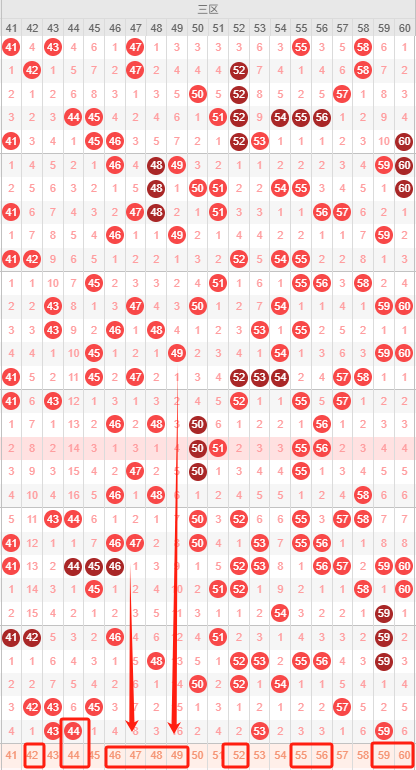 三区:最近三区10期出号情况为:7 7 10 5 2 5 6 3 4 4,总出号情况为512个,平均出号5.2个,本期三区号码走势比较不错推荐:42 44 46 47 48 49 52 55 56 59 60,重点关注:42 44 47 48 52 55 56 59 60。