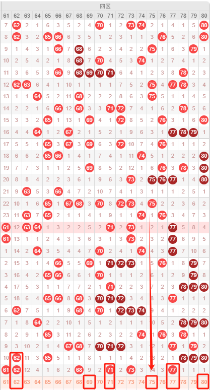 四区:最近四区10期出号情况为:7 4 4 7 6 4 4 7 5 6,总出号情况为54个,平均出号5.4个,本期四区号码推荐:62 69 71 75 77 80。重点关注:62 69 71 77 80。