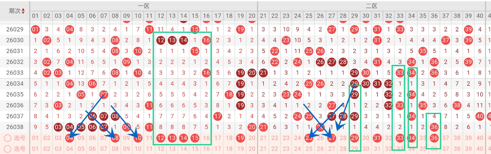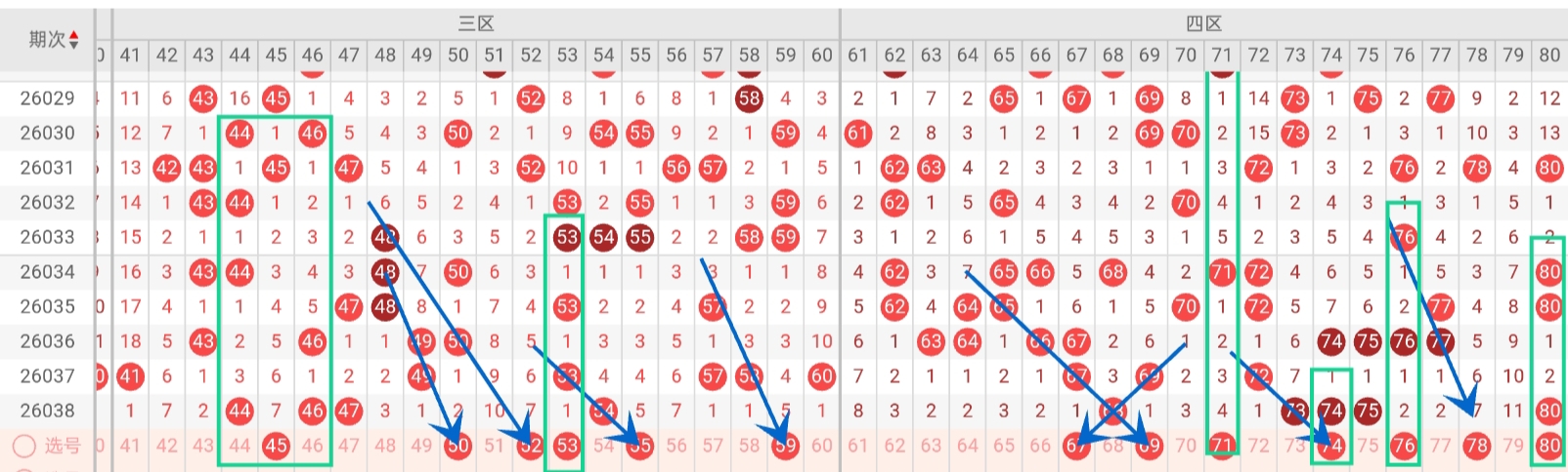 第2026039期福彩快乐8通过以下走势图及一二区间预测分析如下: