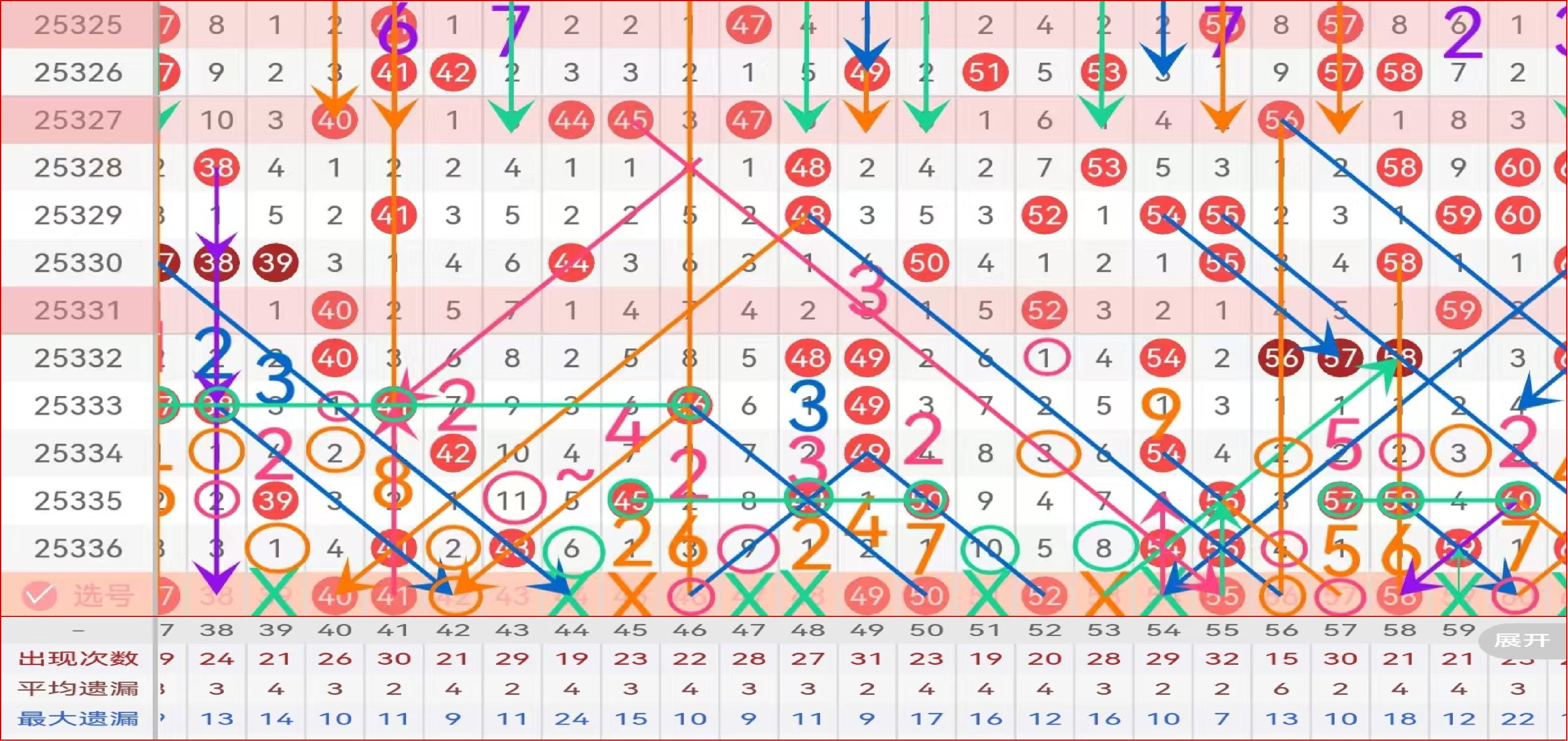 区间推荐主做号码41 49 50 52 55 58;防守号码42 56 57 60;