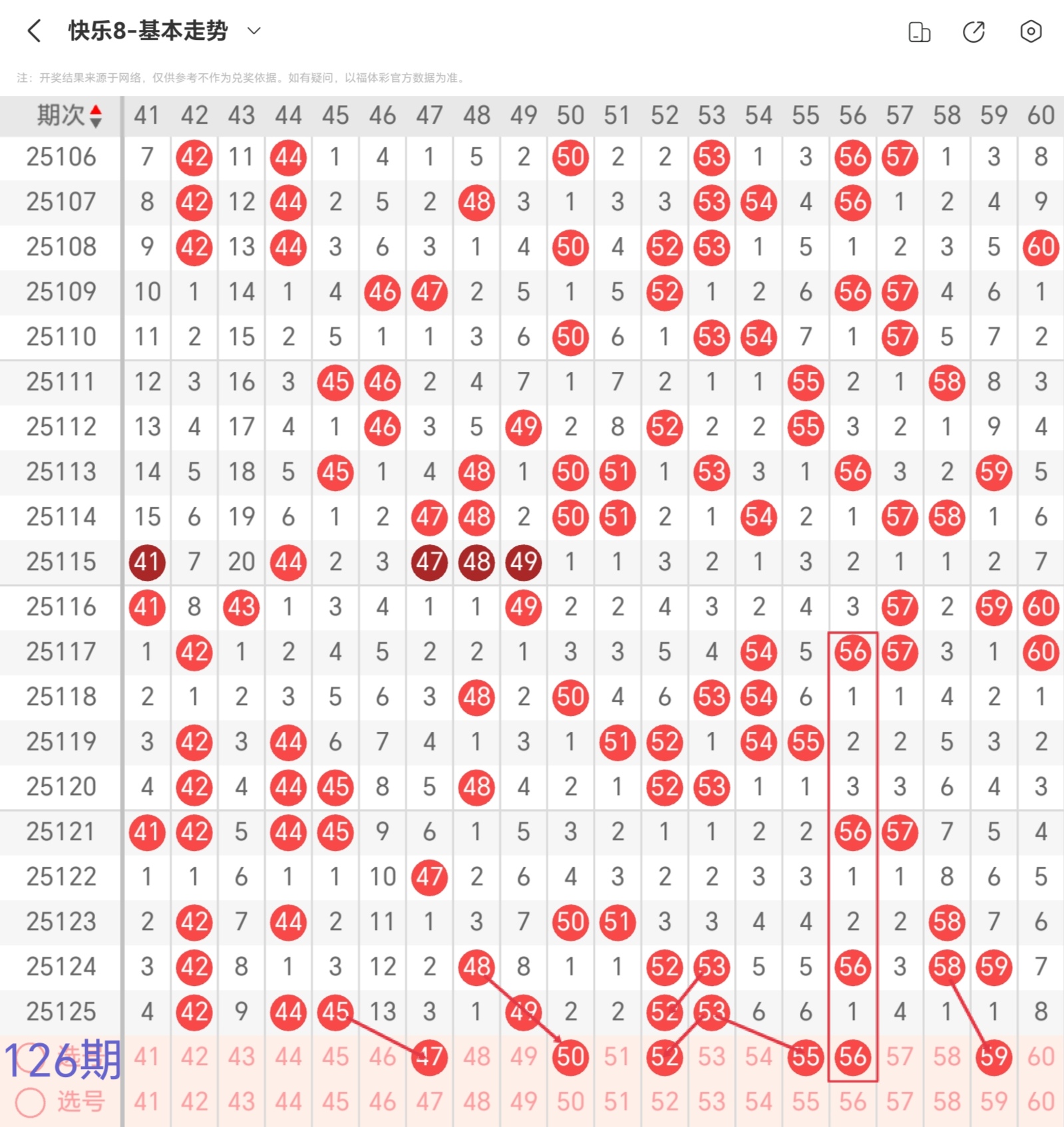 3区在上期走热,开出六个号码,本期可能开出3~5个号码,40可能与42形成隔空斜连走势,防守44号,47可能与49形成隔空斜连走势,防守50与48和49形成三斜连,52可能走三重号,55可能与53形成隔空斜连走势,56可能走出遗漏3-2-1的走势,防守59号。推荐号码:47、50、52、55、56。