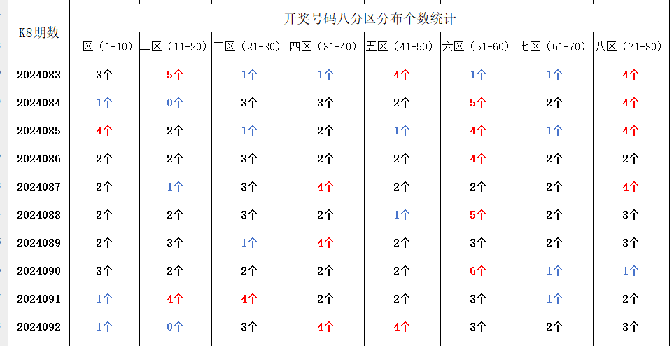 如图,红色字体为热号区,开出4个及以上号码;蓝色字体为冷号区,开出1个及以下号码。以近10期为一个分析周期,其中六区持续走热,有5期开出4个以上号码。四区、五区、八区保持温热走势。七区持续低调,开出1-2个号码。一区近两期开始走冷。本期推测:四、五、六区仍是热度中心,区间开出3个左右号码。一区、二区、七区继续低调走冷,开出1-2个号码。个人分析,仅供参考。