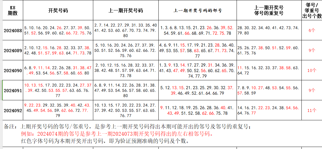 如图,红色字体为上期的邻号、邻重号在下期开出,每期开出10个左右。本期参考邻号:8.10.21.24.28.30.31.33.34.36.38.46.48.50.53.57.58.60.61.63.65.67.71.73.76.80;邻重号:22.23.39.40.41.42.43.44.45.78;重点关注邻重号:41.44.55.78,可做胆码。个人分析,仅供参考。