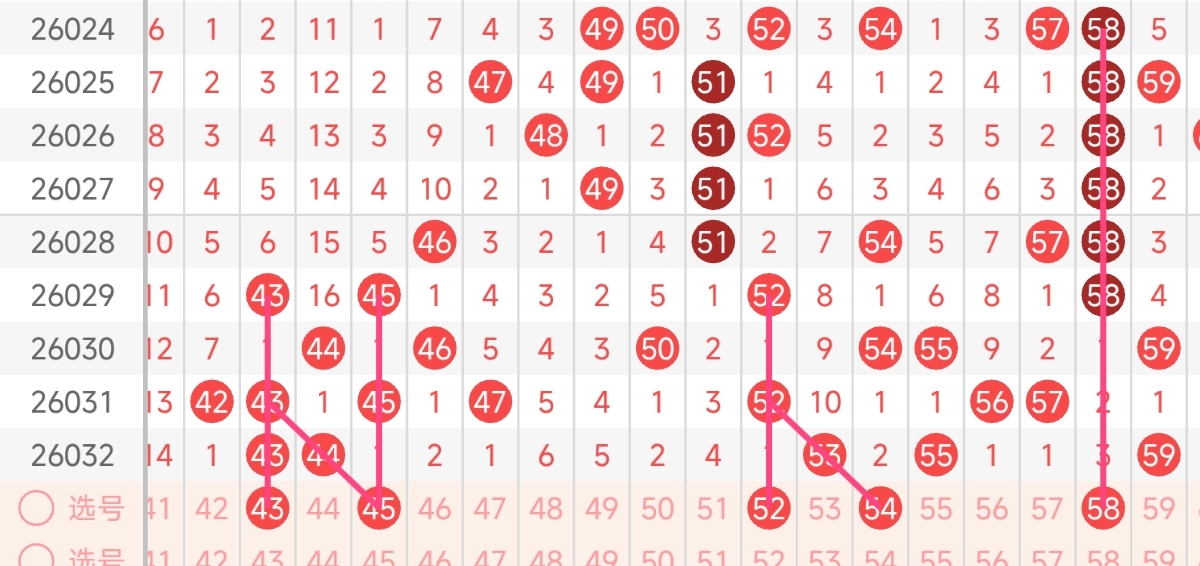 三区号码的出号情况相对较为平稳。平均每期出现3 - 6个。在这个分区中,43、45、52、54、58是比较值得关注的号码。43号是一个连号的常客,经常与其他号码形成连号组合。54号有所连号开出的趋势。45号与25号在三区号码中具有一定的隔期出号的趋势,出号概率较高;58号则是三区的热门号码,值得重点留意。而且还需注意已经连续多期漏出的号码,本期有几率回补。综合考虑,本期三区推荐关注号码:43、45、52、54、58。