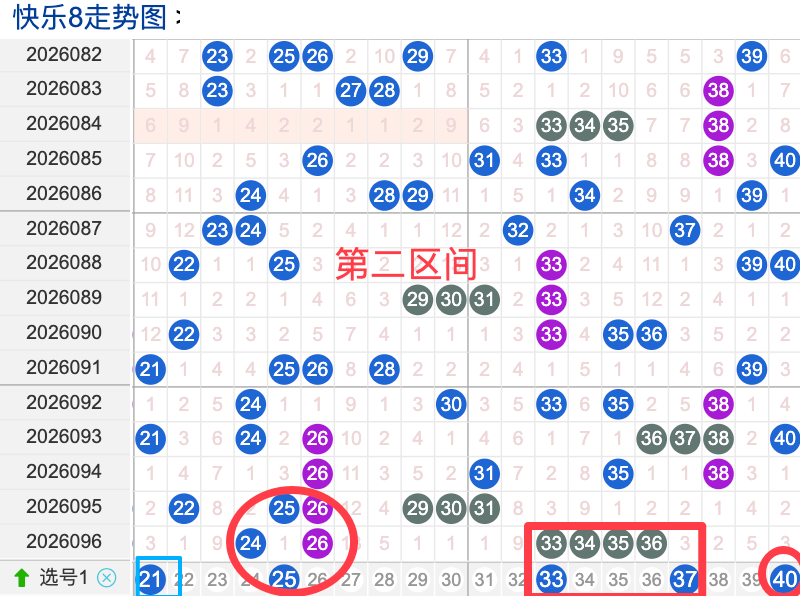 上期二区开出6个奖号(24.26.33.34.35.36)上期回顾二区开出6个奖号二区间在上期落位同比前期的话呈现了一个不变落位趋势,先来看本期号码21整体活跃度较冷,在近 30 期里有一定的间歇性出现,不是每期都开,近期整体走势不是很稳定。号码25近期热度较热,间隔性整体比较热,说明其在当前阶段活跃度较热注意防守。号码33近期活跃度较热有一定的间歇性近期整体走势相对还是很稳定有特别明显的冷热趋势变化,号码37近30期内活跃度较温热,没有明显的连续出现形态走势,整体表现比较温热。