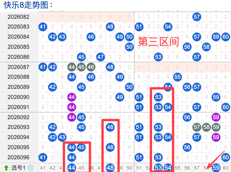 三区间开出了5个奖号(41.44.51.53.60)上期回顾三区开出5个奖号上期的三区间的奖号数量呈现一个递增的形态,4头回补2个,5头回补2个,本期先来看号码44期出现频率相对来说还是很稳定。偶尔有时间隔期数也是很稳定,但是在近期的开奖中较热注意防守,号码48在近 30 期内出现次数相对是稳定的号码,近期的活跃度也是较稳定。号码54有一定的间歇性,通常间隔5-3期会出现一次,没有明显的连续出现态势,走势相对还是很稳定,在整个第三区间的表现较温热本期还是可以防守的。号码59走势相对近期较热,近期没有连续间隔落号的情况,活跃度近期处于热状态注意防守。
