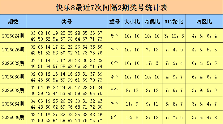 冷温热码分析:在快乐8分析中,我们一般把遗漏0-2期的号码称为热码,遗漏3-6期的号码称为温码,遗漏6期以上的号码称为冷码,最近7期奖号冷温热码出现个数比为224078,连续7期冷温热码理论个数比为193982,上期奖号冷温热码个数比为,3710,当期理论冷温热码个数比为3512,目前冷码有7个,温码有28个,热码有45个,本期预计冷码走势低迷,注意冷温热码比为0614