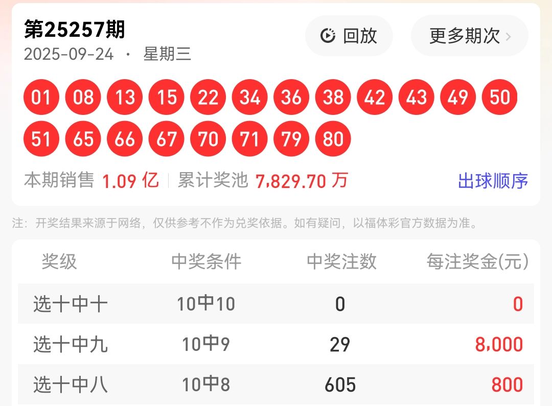 上期福彩快乐8第 2025257期开奖号码为【01 08 13 15 22 34 36 38 42 43 49 50 51 65 66 67 70 71 79 80】,其中大小比为12:8,奇偶比为10:10,和值为900,跨度为79,四区间比为4:4:5:7。下面是对本期对于 01 - 80 的四个区间进行详细分析。