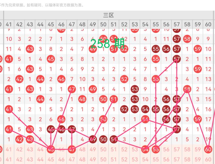 41-60区间,在上期开出了5个号码(42 43 49 50 51),此区间出号较多 ,但是短期内过热。按照走势规律密集出号后往往会出现一定程度的回落,预计本期会继续开出3-4个左右。这个区间的号码特征比较明显,经常会出现遗漏号回补和二连号的情况。号码54和55这一组二连号在走势上较好,本期考虑这俩号码会同时开出。号码60遗漏19期,远远超过最大遗漏,本期应该会回补开出。前期开出的号码43和49带动中间等距号码45和47的出现。因此综合推荐该区间号码【45 47 54 55 60】