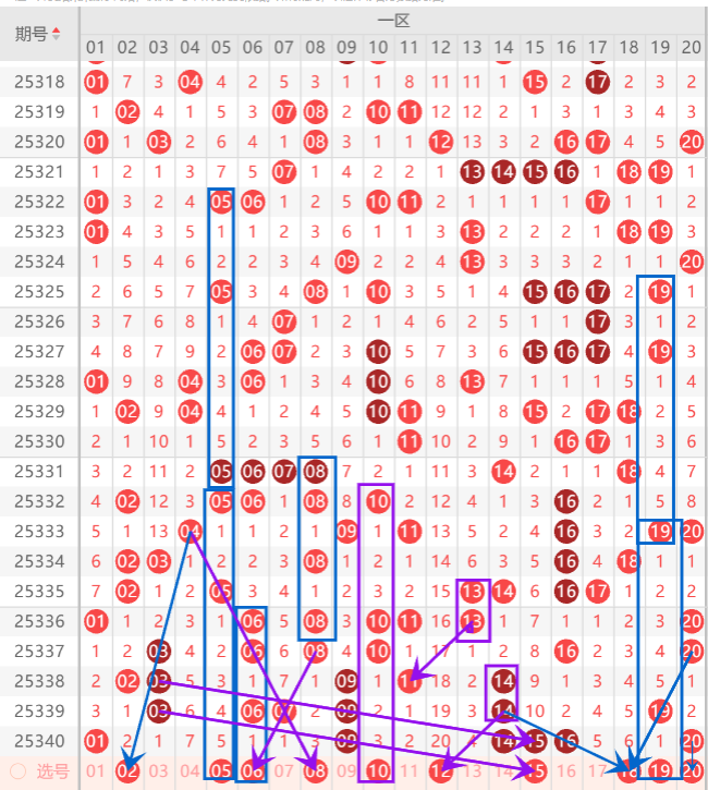 一区在近期的走势分析,近期一区间是温冷形态,上期一区间再次开出了6码,而且上期区间开出的形态是三重码和连号走势,上期小妹在文中布局到了4码开出,那么本期一区间重点关注的形态是对称形态,重码走势,空位回补,那么本期的对称形态上注意02.05.10.19中布局1-2码开出机会,而重码走势上注意01.15.20中参考1-2码走重机会,至于空位回补上的12.18.中布局一码机会,上期一区间重点关注了重码分边上开出了一码,那么本期重点关注隔期回补上布局1-2码机会,如图所示。