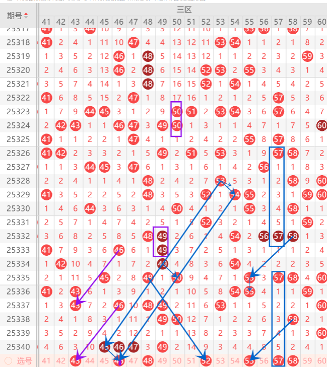 而三区的打底号是42.43.44.46.48.50.52.55.57.58.59中参考4-5码开出机会,