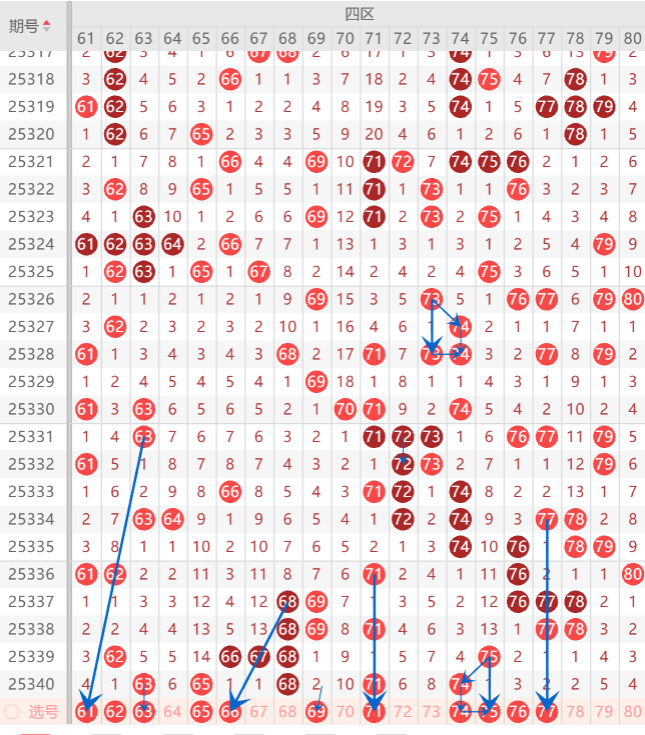 四区间的打底号是62.63.65.66.69.71.73.74.75.76.77中参考2-3码开出机会