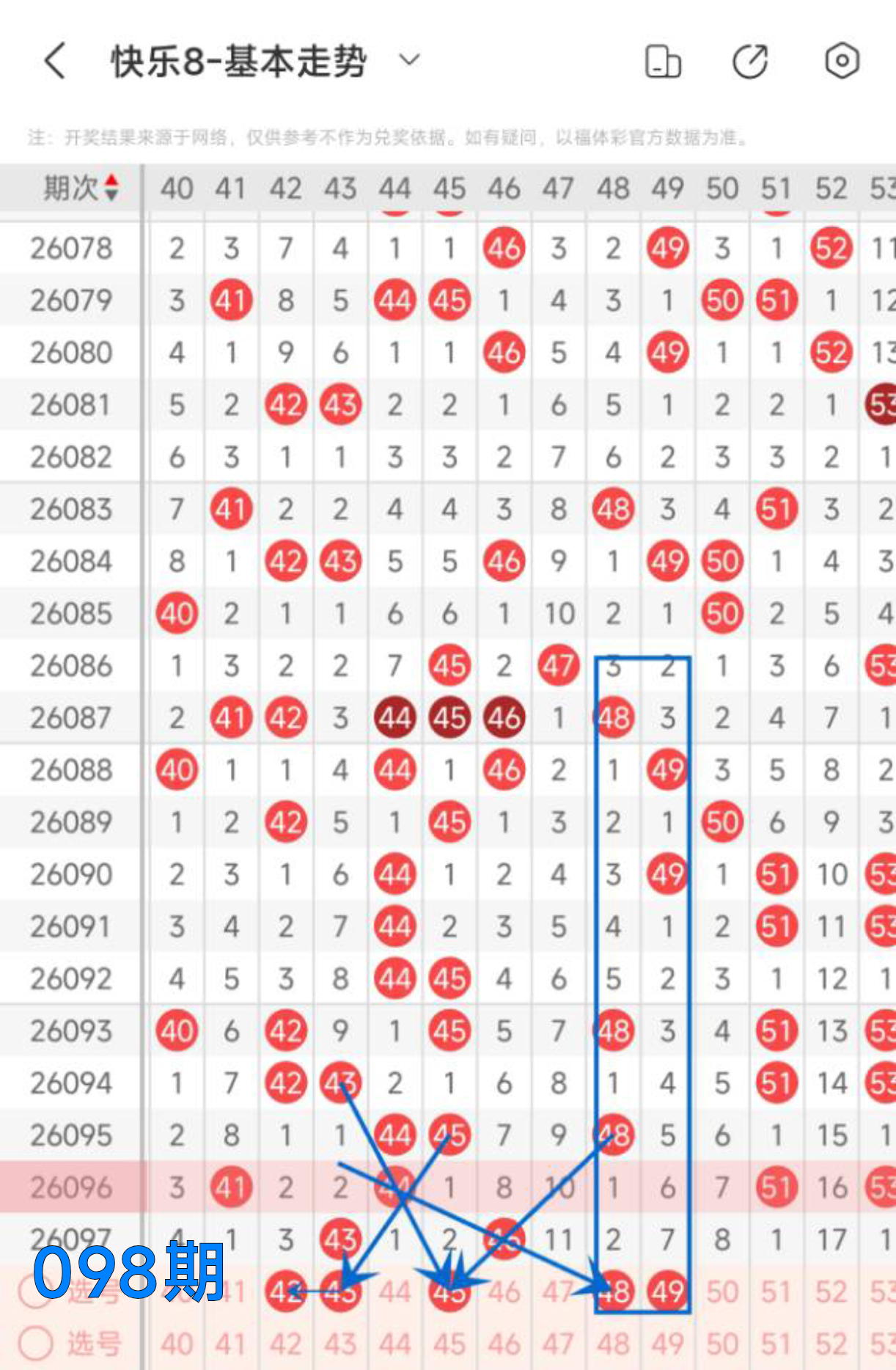 48 49号:这两个号码本期是二选一的对称下落走势,看好48号偶数斜连,自身对称下落的走势。