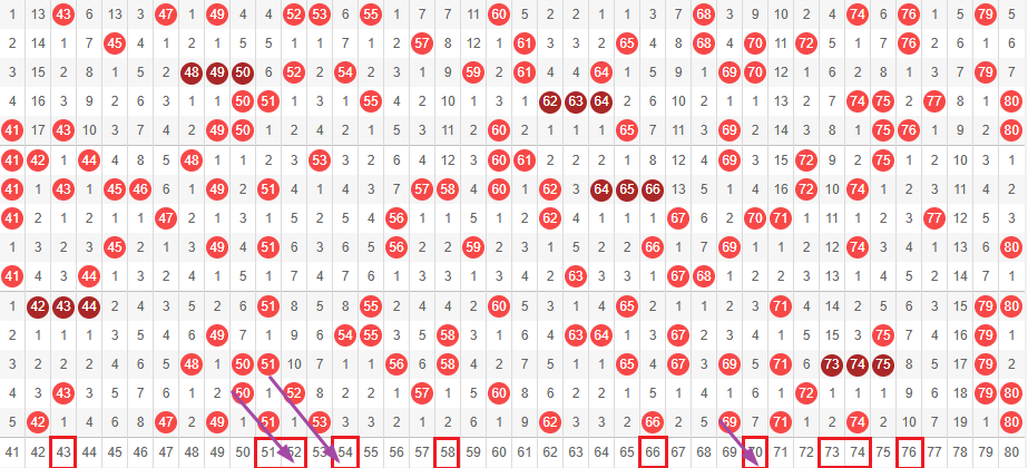 接下来我们一起看走势图,我们把01-40分为前区,41-80分为后区。