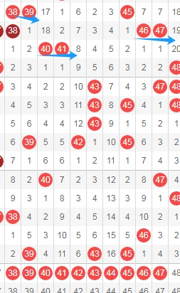 上图是福彩快乐8开奖号码走势分布图中的其中一部分走势图,上面标注出来的数字一共是10个数字,把这些数字当成一个区域,你们看这个区域已经连续11期没出现连号组合了,看上面标注出来的蓝色小箭头就知道,上面开出连号组合4041一直下来连续11期没出现连号组合,这个区域的连号组合有3839 3940 4041 4142 4243 4344 4445 4546 4647,这些连号组合一共有9组,那么本期关注这些连号组合出一组或者两组吧,个人看好3839 4243 4647。