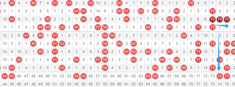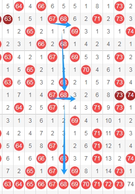 上图是福彩快乐8开奖号码走势分布图中的其中一部分走势图,上面标注出来的数字一共是11个数字,把这些数字当成一个区域,你们看这个区域已经连续6期没出现连号组合了上次是连续5期没出现连号组合,看上面标注出来的蓝色小箭头就知道,上面开出连号组合6768一直下来连续6期没出现连号组合,这个区域的连号组合有6364 6465 6566 6667 6768 6869 6970 7071 7172 7273一共有10组连号组合,那么本期关注这些连号组合出一组或者两组吧,个人看好6364 6869 7071。
