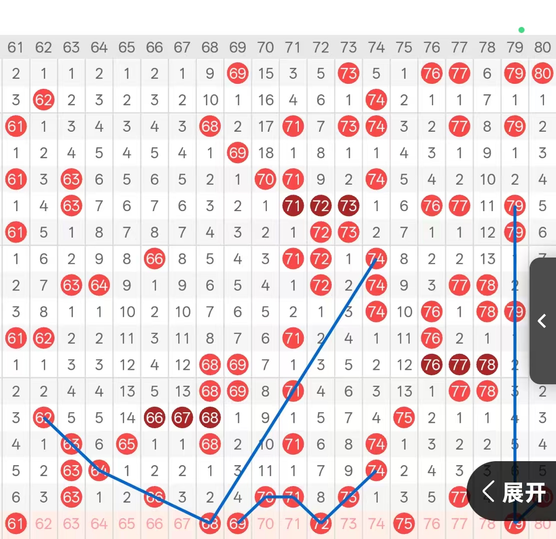 四区:上期四区间开出七码,六字头头部位置开出63的三重,中部位置开出空二的66,以及尾部位置十一期遗漏的70与71以对子形态开出,七字头开出74的双重分边73,以及尾部位置77-80同时开出。本期六字头头部位置关注64的下落,以及65-68两码空二回补,尾部位置考虑70-71对子的分边69-72两码下落一码即可,七字头关注尾部位置的77-80同开,可以做一码重号,以及79的七期遗漏下落。