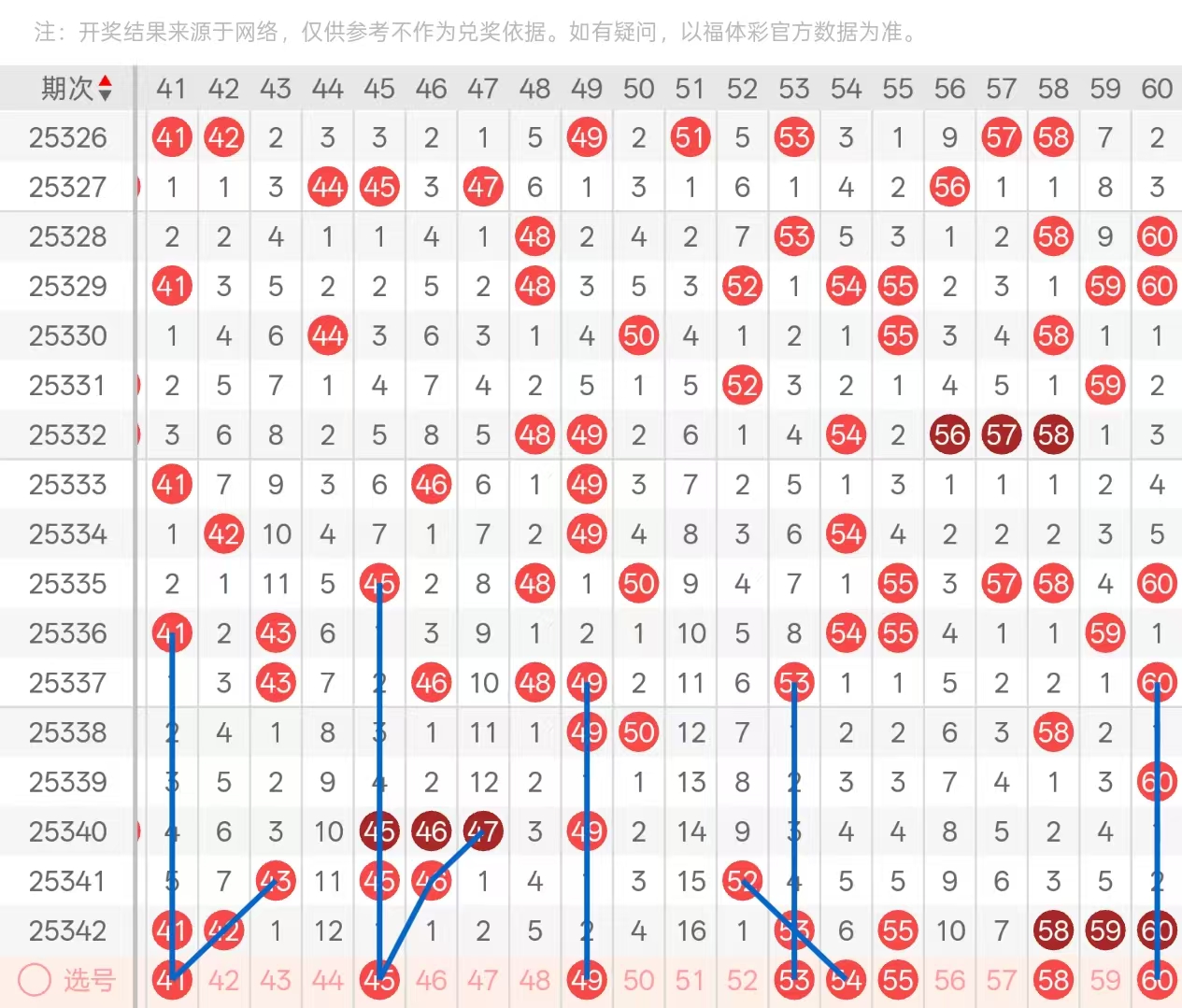 三区:三区间上期开出七码,四字头上期开出头部位置五期遗漏的41,以及等距七的42以对子形态开出,后半部分一码没有开出,形成了断区。五字头开出头部位置52的孤码分边53,以及双重空五的55,尾部位置开出58-59-60三码的连号。本期四字头头部位置优先考虑41-42两码对子的一码做重,以及防守44的十二期遗漏开出,45-46对子考虑一码下落即可,尾部位置48-49二选一。五字头头部位置防守51的大遗漏开出,以及54的六期遗漏下落,可以考虑该位置以对子形态开出,尾部位置58-59-60三码开出可以关注一码做重,优先级58-60二选一。
