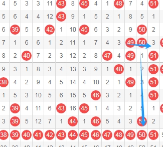 上图是福彩快乐8开奖号码走势图其中一部分走势图,这个区域是从号码38到号码51一共是14个数字,这14个数字是连续6期没出现过连号组合,这个 区域的连号组合有3839 3940 4041 4142 4243 4344 4445 4546 4647 4748 4849 4950 5051一共是13组,那么本期可以关注这个区域的数字出连号组合,个人最看好4243 4546 4950 4849。