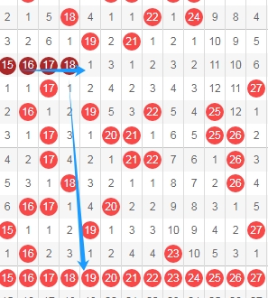 上图是福彩快乐8开奖号码走势图其中一部分走势图,这个区域是从号码15到号码51一共是27个数字,这13个数字是连续8期没出现过跨度二组合,这个 区域的跨度二组合有1517 1618 1719 1820 1921 2022 2123 2224 2325 2426 2527一共有11组,那么本期可以关注这个区域的数字出跨度二组合一组或者两组,个人最看好2527 1719 1820。