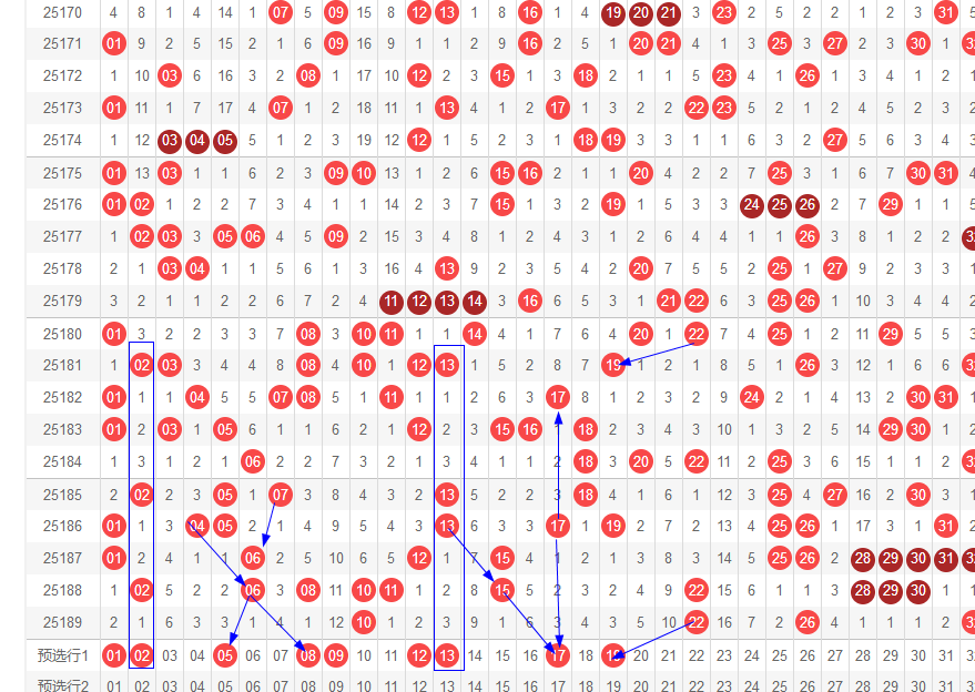 本次预期推荐的号码第一个是01号。01号我们看到和中间那个02它们完全是一个相反的走势,形成了一个对等的走势,然后2号是隔三隔二隔一的一个递减走势,然后下来是05号,大家看到是07号的蓝色箭头,中间两个06,可以提出05这个对焦线走势208。我们看到04到06到08的一个间隔走势,09是上下对称的,12可以考虑,然后他还有个大肠斜连13,我们也看到了这上下对称的一个13走势,加上一个12,感觉很不错,然后还有17号以及19号,如下图所示。