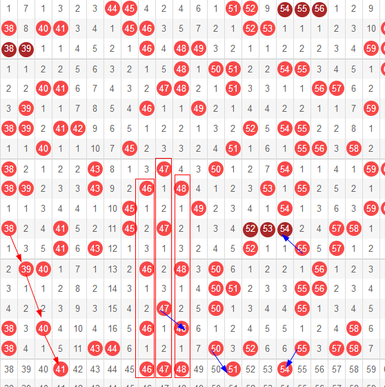 40到60区域推荐的号码首先是41号,我们先看41,他从38那个地方间隔一期出了39,然后再间隔两期出了40,再间隔一期出41,属于一个对称的一个走势。下面就是46、47和48这三个号码。首先我们看46号,他是一个。间隔321递减的一个走势,然后47是一个完全对称的走势。48也是间隔321的一个走势,所以这个区域考虑它是连码,然后下来就是51号从47 48间隔一期出50再出五一的一个走势,54号本身是一个对称走势,然后55大家看一下,历史上经常会带着54出来。所以推荐54。