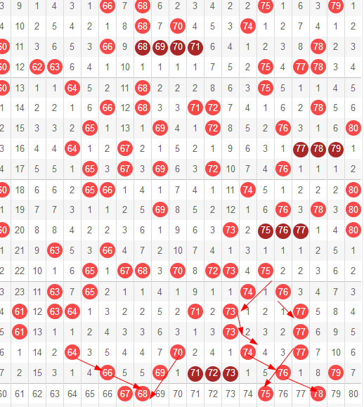 60~80区域推荐的号码比较少,因为这个号码走势比较难,看不出来,所以推荐的第一个号码是67号,本身今天应该出的,但是他没有出,那我们再追一期67号,然后就是68号,68号有两个条线,我们看64间隔一期出66。再间隔一期出68,然后旁边我们看到了是706968的一个斜连,然后其实5号,其实我们看一下旁边的那个757473,隔两期跟旁边这个77虽然很相对,但是他是一个像太极八卦一样的对称走势。可以考虑一下,那么747678间隔一除78在这个区域的号码大家可以去考虑一下,不妨打一个6878的同尾。