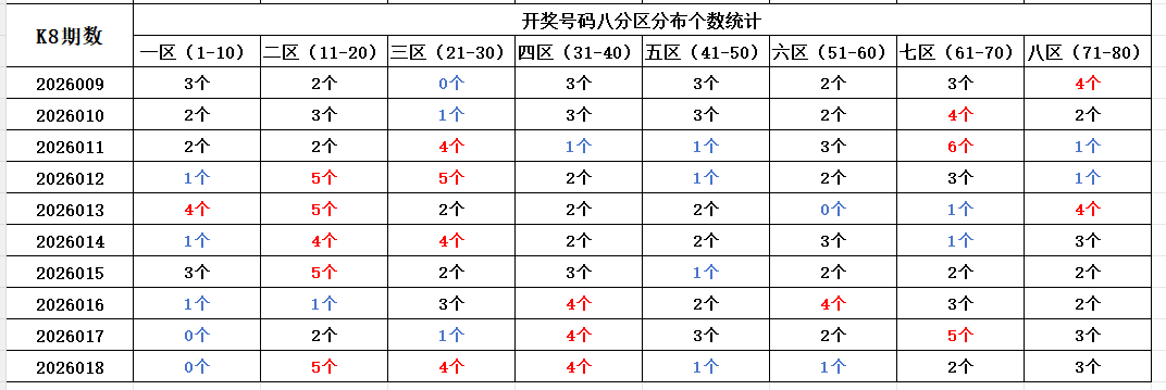 首先看上期回顾,“快乐8”第26018期开奖结果:11.12.14.15.18.21.22.23.29.32.33.35.40.41.55.65.69.74.75.78;通过分析开奖号码,分享第一个数据分析:统计开奖号码的八分区冷热走势,判断出号规律。以近10期开奖号码的八分区统计数据为例: