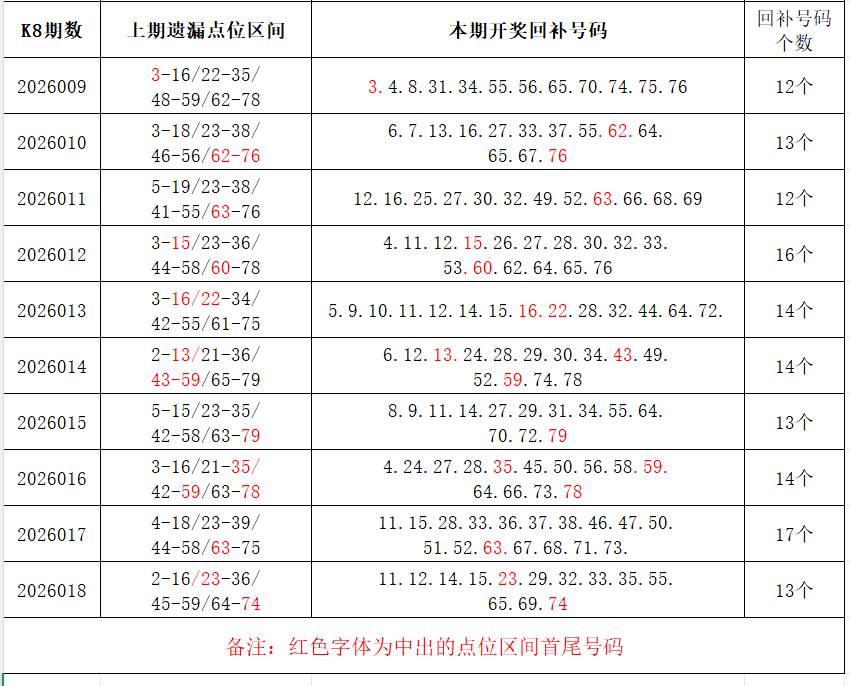 如图,上期的遗漏号码在下期开出10个左右,即为回补号码。定准点位区间首尾号码是关键!以上期2026018期为例,定位4个遗漏区间,围中13码!结合上期开奖号码,以跨度值大于或等于7为依据,本期关注3个遗漏区间:1-11/41-55/55-65;重点关注遗漏区间:3-16/24-35/42-56/64-76。点位区间号码和大底号码请勿混淆,个人分析,仅供参考。