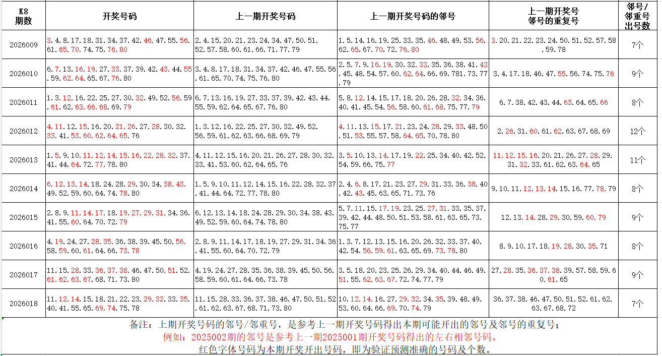 如图,红色字体是上期邻号、邻重号在下期开出,每期开出10个左右。上期邻号开出7个,邻重号开出0个。本期参考邻号:10.16.17.19.20.24.28.30.31.36.39.42.54.56.64.66.68.70.73.76.77.79;邻重号:11.12.13.14.15.21.22.23.32.33.34.40.41.74.75;个人分析,仅供参考。
