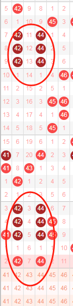 - **40**(中区):跨区热号,与**44-45**连号区形成跨度跳号(40→44)。