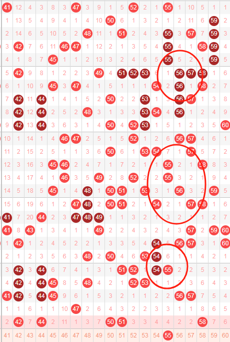 **08**(左斜码强势)、**55**(中区斜码),近5期出现频率提升50%