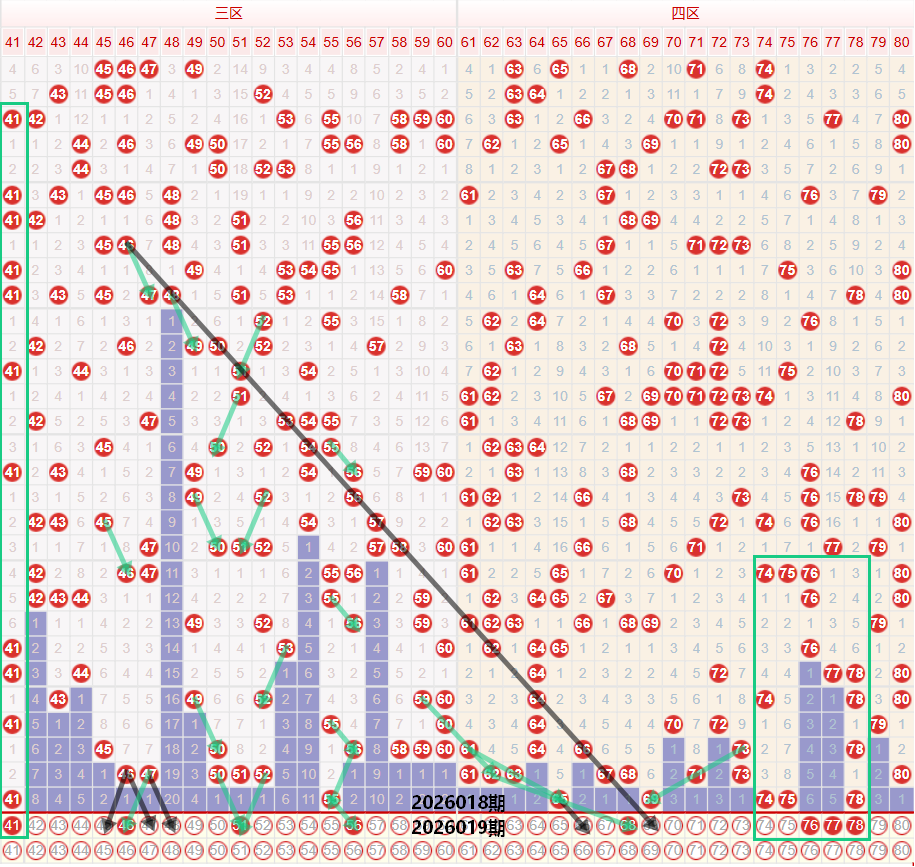 如图所示:在本期大数区的选号中注意在上期的走势中三区间开出了2枚中奖号码,落位在区间的最低位走势,在近期的走势中,单区间的地位走势,多次出现连续走势,因此在上期三区间落位在区间的最低位走势之后,本期要注意三区间的落号数量继续保持在均值范围以下的水平,重点关注在46 47 50 51 52的位置考虑遗漏一期的走势,前段位置开出了龙头号码41本期自己哟50 60的交替走势,中间位置在上期开出了55同时四区间也是开出了65的同尾二连走势,在近期的走势中55 56 65 66的四码中多次出现连续走势,以及交替走势,本期要注意56的边号走势,如果本期考虑三区间的落号数量出现幅度较大的上升幅度,要重点关注55至60的位置开出奇数或者是偶数的连号走势,四区间上期开出了5枚中奖号码,落位在区间均值走势,本期注意在上期开出74 75 78的位置考虑连号延续走势,重点考虑78的重号走势,6字头的号码注意68的折返走势或者是考虑69的重号走势。