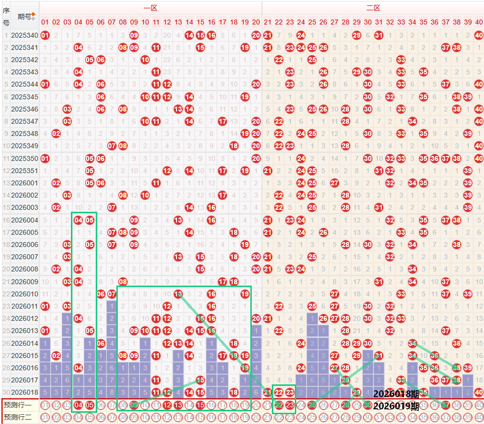 如图所示:在本期小数区的选号中,注意在上期的走势中一区间开出了5枚中奖号码,在连续两期落位在区间最低位走势之后,上期的开奖结果中回调至均值走势,落号密度依旧保持在1字头头部位置,在上方的走势中,1字头的位置出现了连续多期的连续走势,因此在上期一区间开出11 12 14 15的位置下方要注意继续保持连续走势,重点关注重号走势,这里要注意上期开出了11 14的同路双码走势,以及12 15 18 21的同路四码走势,本期注意12 15 18 21的重号选择,前段位置0字头保持了两期的断号走势,在上期开出12 15 18 21的同路四码走势之后,首先要考虑重号走势,其次要注意向前延续出同路走势,09或者是05 09的奇数双码走势,另外0字头目前保持了连续两期的断号走势,本期要注意连号的回补走势,二区间上期开出了8枚中奖号码,落位在区间的最高位,区间保持着区间同尾走势,以及多组连号走势,本期注意在上期开出21 22 23的位置重点考虑重号走势,建议优先考虑二连的重号形态,向后在上期开出22的位置,本期注意22 25 28的同路三码走势,在近期的走势中22 25 28以及32 35 38在二区间多次开出,本期注意再次开出同路多码走势,在上期的二区间有两个单码延续走势28 35本期注意分边的延续走势,重点关注分双边的延续走势,后段位置优先考虑37的奇数延续第三期走势,在上方开出相同形态的偶数多期走势,共出现两次。