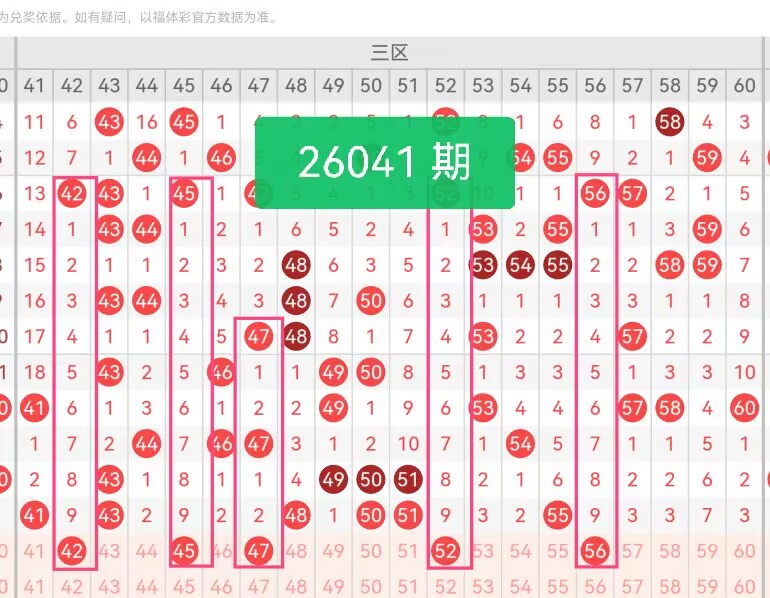 上期第三区间开奖6个号码,本期可能会稳定开出。42做区段起点,稳住组合前端;45位于中心位置,承上启下,提升组合的搭配;47奇数点缀,平衡奇偶结构;52向后延伸,拓展组合覆盖范围;56收尾,让三区号码从前往后逐步推进。整体节奏舒缓,号码分布均匀,既保留上期活跃度,又避免过度集中,适合稳健搭配。