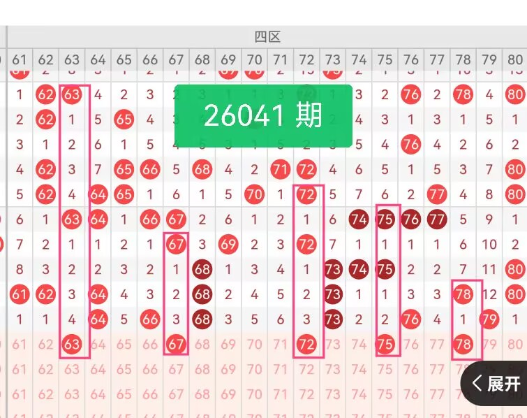 上期第四区间开奖6个号码,本期有望减少开出。63做区段起点,与上期号码64形成温和呼应;67位于中段,增强组合稳定性;72过渡衔接,让号码流动更自然;75靠近后半段,拓展覆盖深度;78收尾,稳固区段后端。号码疏密合理,奇偶均衡,既延续后区热度,又控制出号密度,与前三区形成完整覆盖,整体布局均衡。