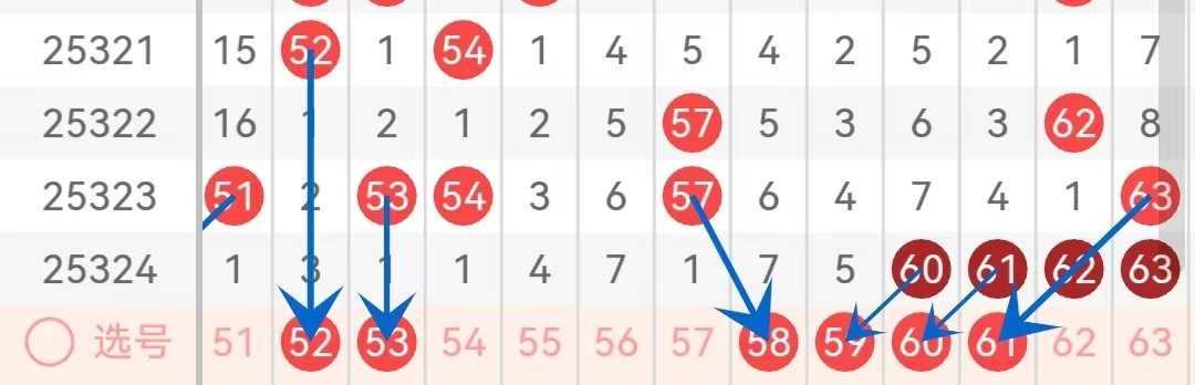 51-60区域:近三期出号数量为:1.4.1,本期重点关注数字:52.53.59,本期需要预防的组合58.59.60.61