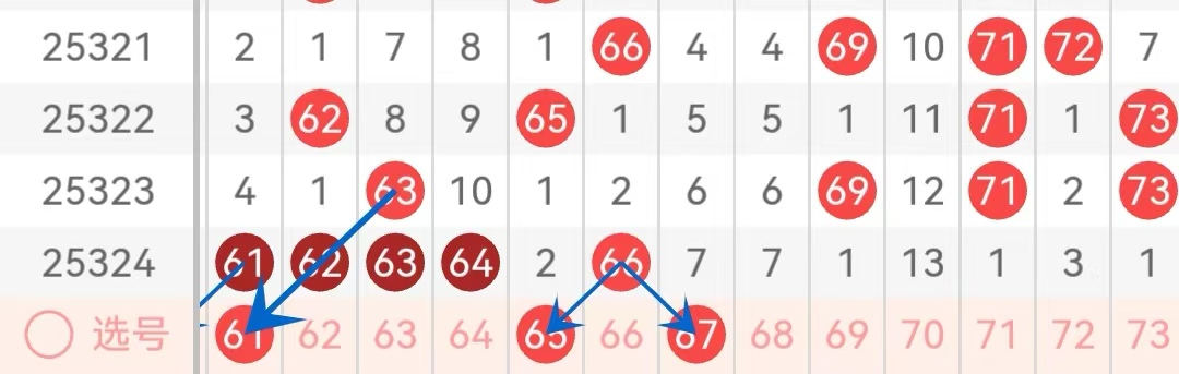 61-70区域:近三期出号数量为:2.2.5,本期重点关注数字:61.65,需要注意的数字67